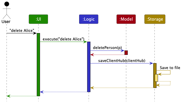 The Sequence Diagram below shows how the components interact with each other for the scenario where the user issues the command delete Alice.